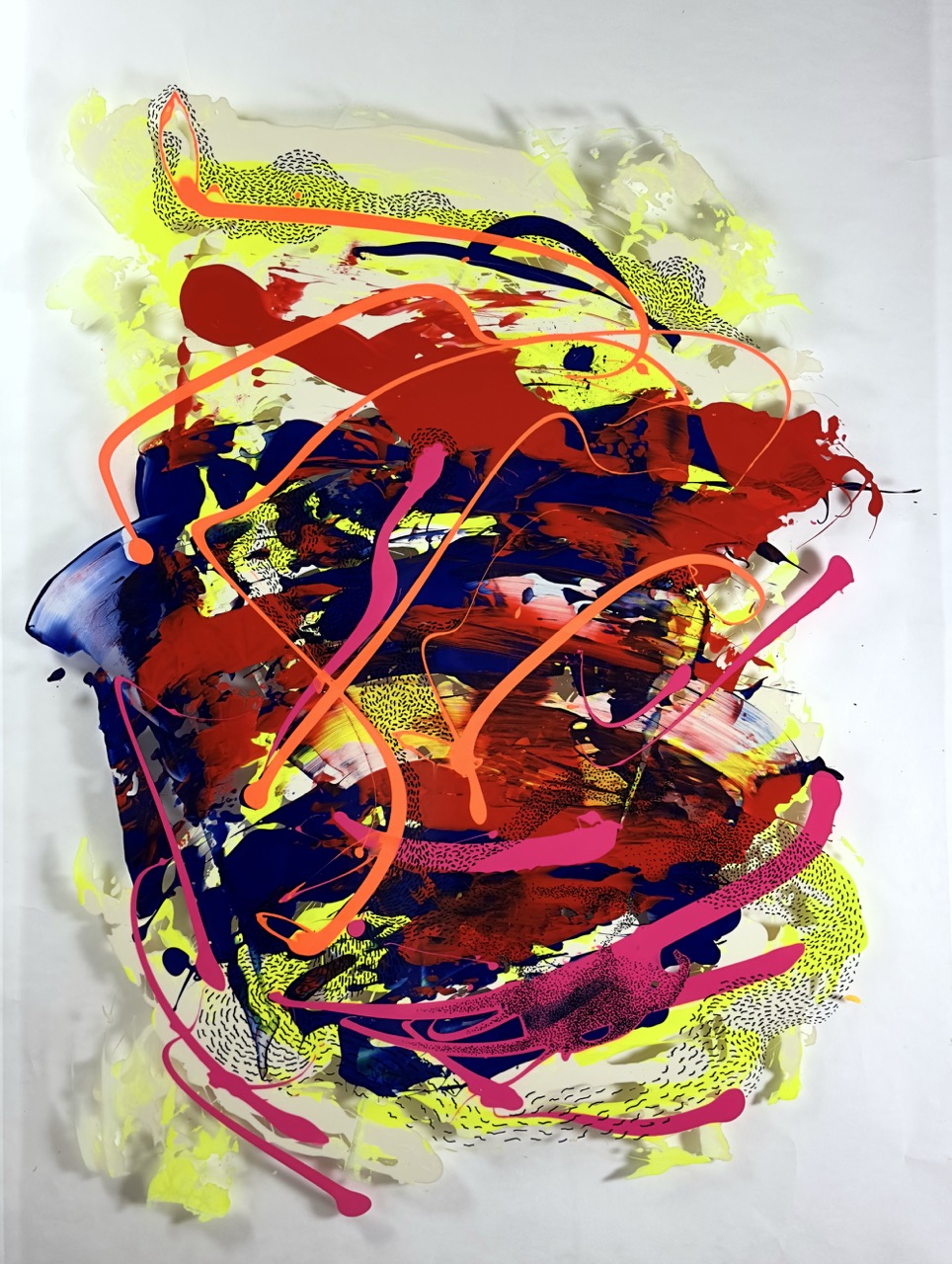 „Untitled“, Rückseitenmalerei (Acryl), Vorderseitenzeichnung (Grafit) auf transparenter Folie, 50x70 cm, 2023