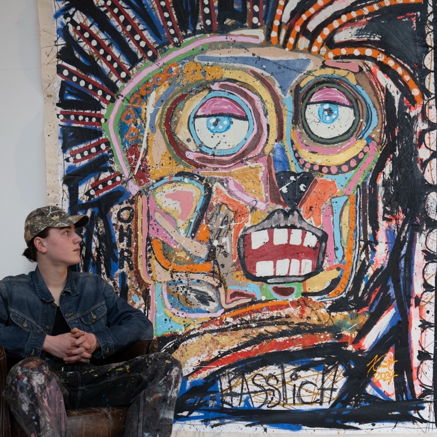 Vincent Mühlenbeck (*2004 in Hamburg) begann bereits im Alter von 17 Jahren, als freischaffender Künstler zu arbeiten. Seit 2024 studiert er Kunst an der Hochschule für Bildende Künste (HFBK) in Hamburg. In der aktuellen Werk-Serie legt Mühlenbeck die eigentliche Struktur aller - auch seiner bisherigen - Bilder frei: Die Komposition durch verschiedene Flächen, das Grundgerüst seiner Werke. Ohne weitere Farbschichten, Blick auf den unverdeckten Bildaufbau. Gleichzeitig interessiert Vincent Mühlenbeck weiter die Erforschung von Haptik. Mit Strukturpaste werden die Flächen aufgerauht, zusätzlich verstärkt, indem der Künstler mit hochpigmentierter, weicher Ölkreide die aufgerauhten Stellen weiter bearbeitet und die erhöhten Strukturen damit akzentuiert. Haptik und Farbigkeit gehen einen Bund ein, verstärken sich gegenseitig. Wieder spielen große Augen und Münder in dem Sujet des jungen Künstlers eine zentrale Rolle. Ebenso das Motiv „Hand“, das durch Farbe oder Struktur hervorgehoben wird. Mühlenbeck zeigt in der neuen Werk-Reihe eine weitere, ruhigere Seite seiner vielfältigen künstlerischen Sprache, wobei die ganz eigene Handschrift des Künstlers wie immer direkt erkennbar ist. Der 20jährige, der seinen Malstil als „expressionistischen Comic-Stil“ beschreibt, konnte nach einigen Solo- und vielen Gruppen- Ausstellungen unlängst mit der ar-galleryHamburg sein Debüt auf dem internationalen Parkett feiern: Auf der größten Kunstmesse Skandinaviens, der Enter Art Fair Kopenhagen. Mit einem „sold out“ und dem Lob des Messe-Gesellschafters ein voller Erfolg.
